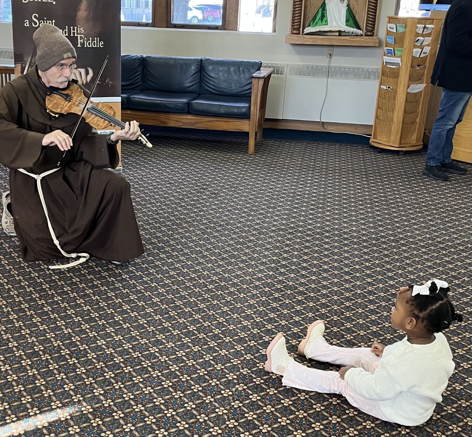 Michelle is enthralled with Br. Al playing the violin before this musical on the life of Blessed Solanus Casey last Sunday.